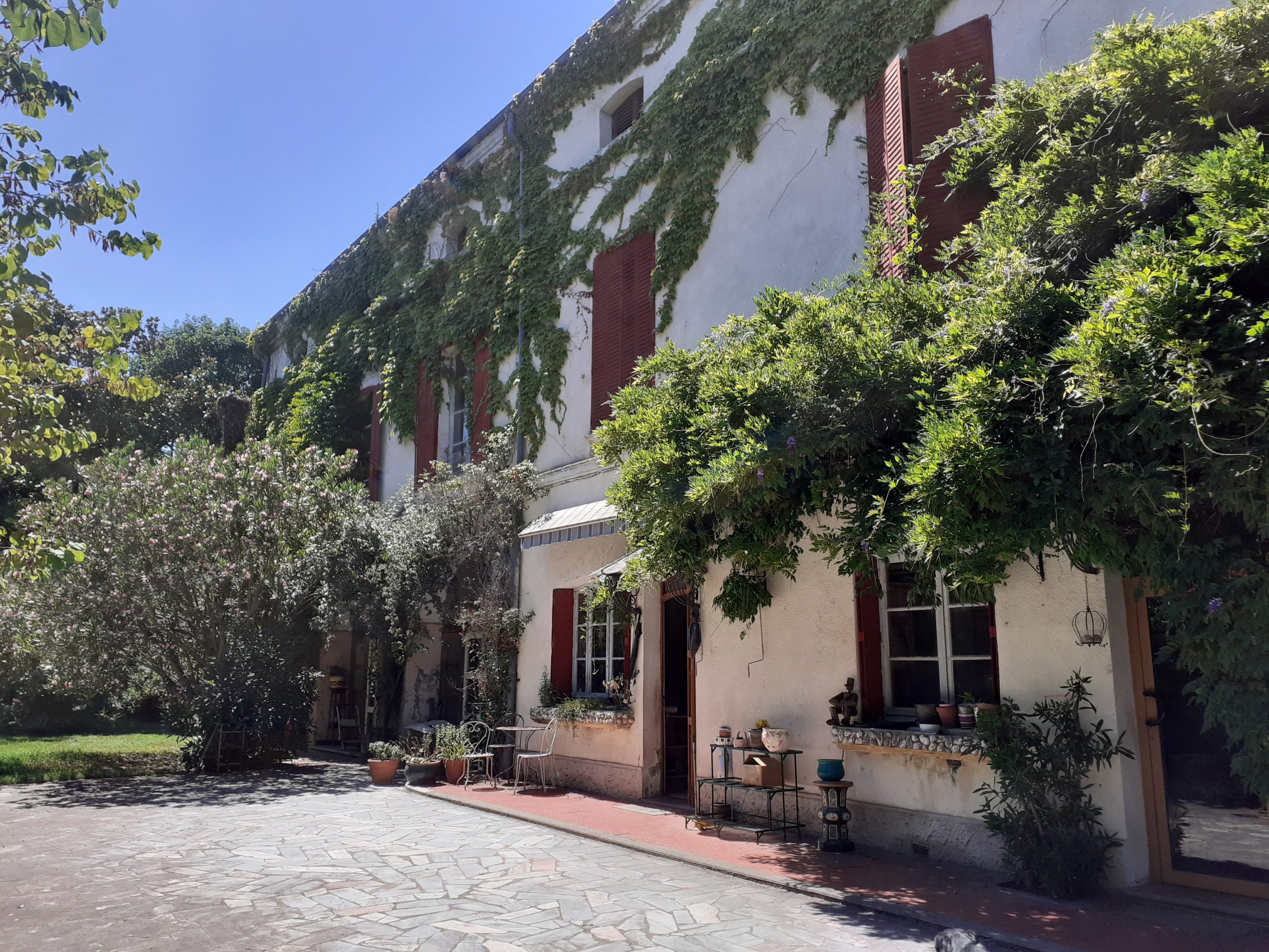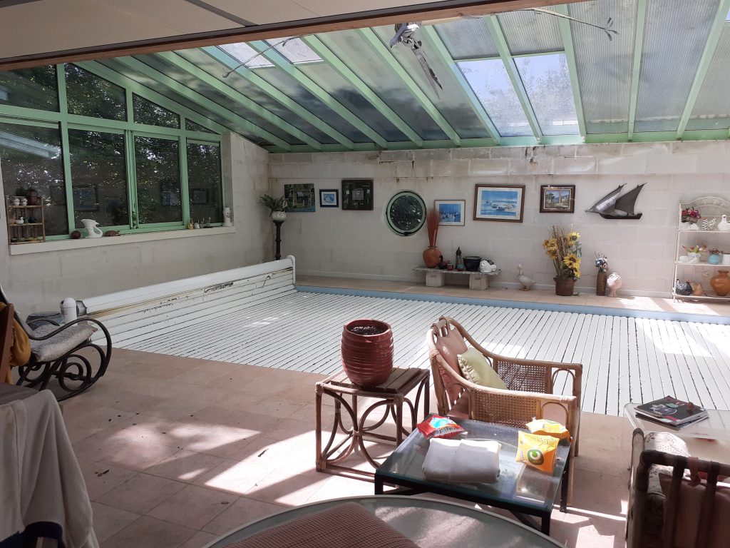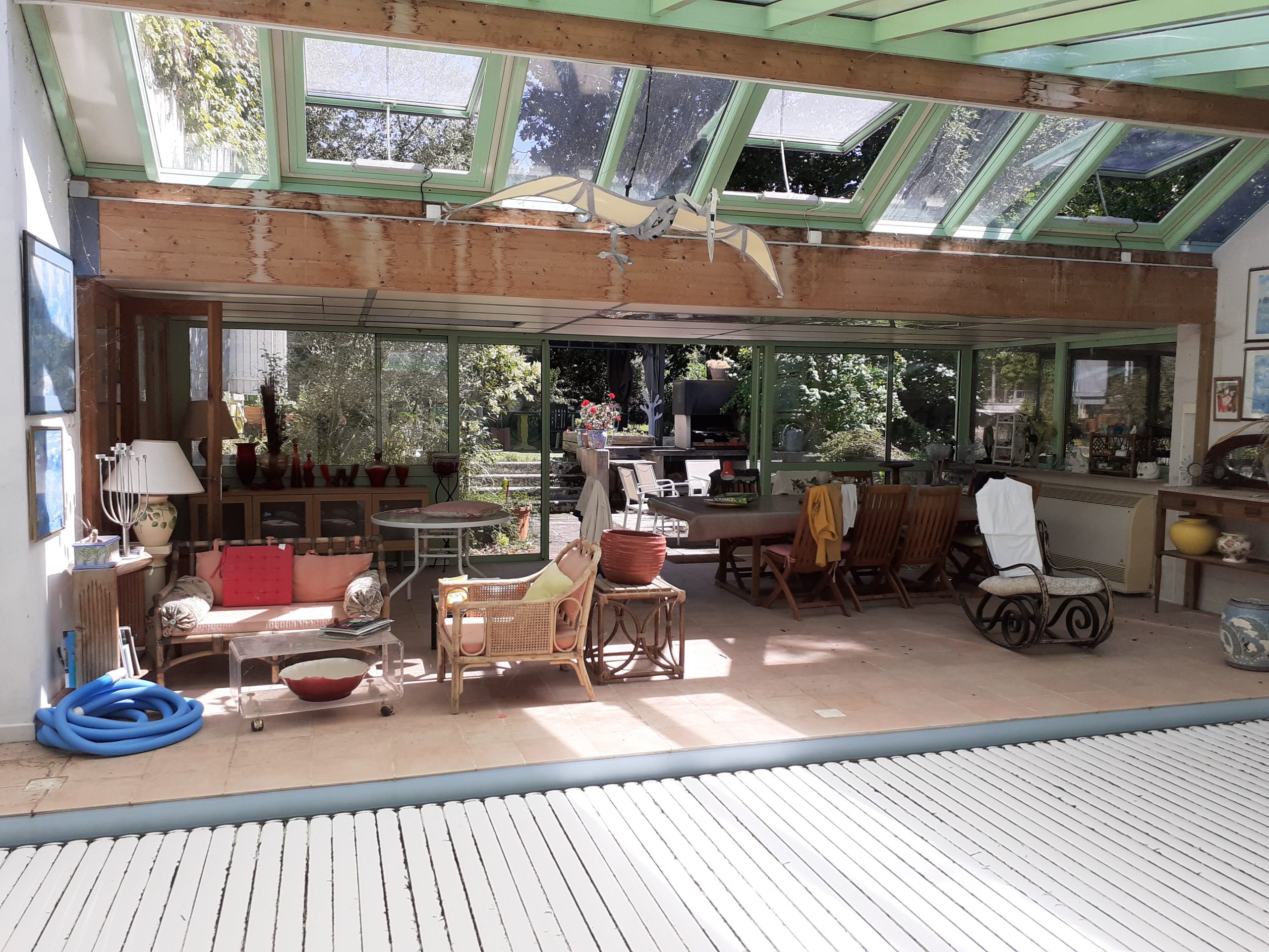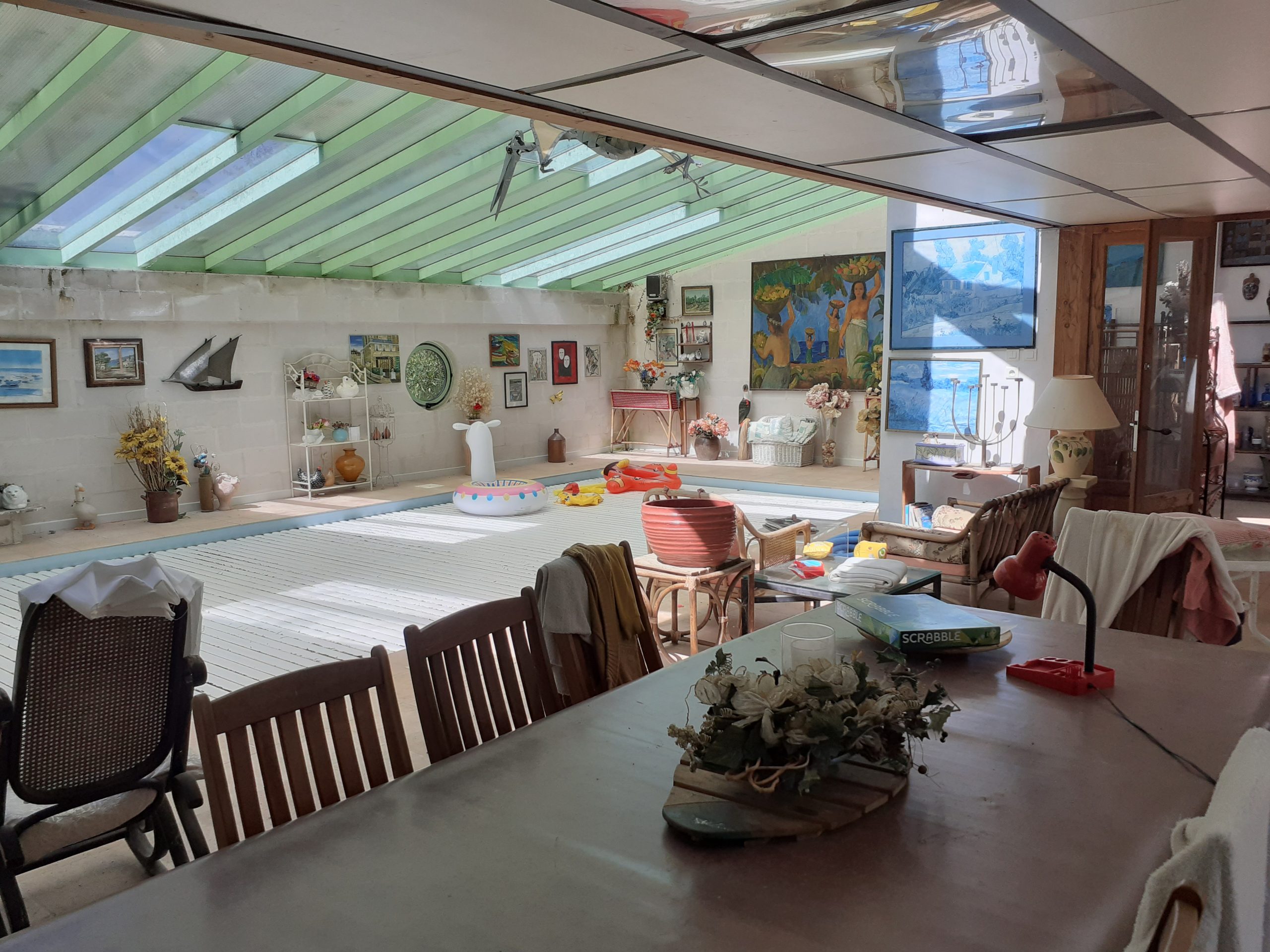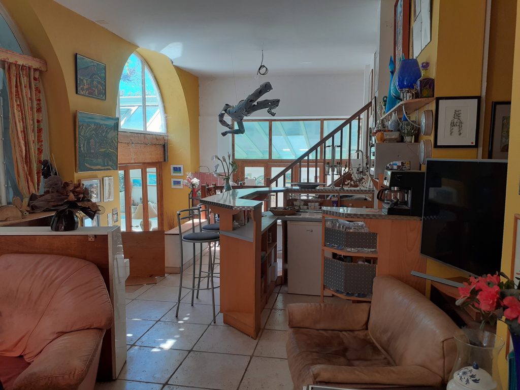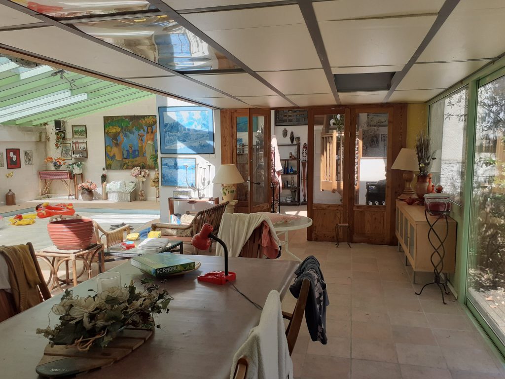 Pour la partie habitable, la maison dispose d'une entrée de 10m², d'une cuisine séparée et équipée de 32m², un salon/séjour de 52m², 9 chambres allant de 16.5m² à 32m², et plusieurs salle d'eau et WC. La maison possède une piscine couverte et chauffée, un garage de 52m², deux terrasses de 85 et 130m² en RDC, deux terrasses en 1er et 2ème étage de 60m², ainsi qu'un atelier. 120m² environ.